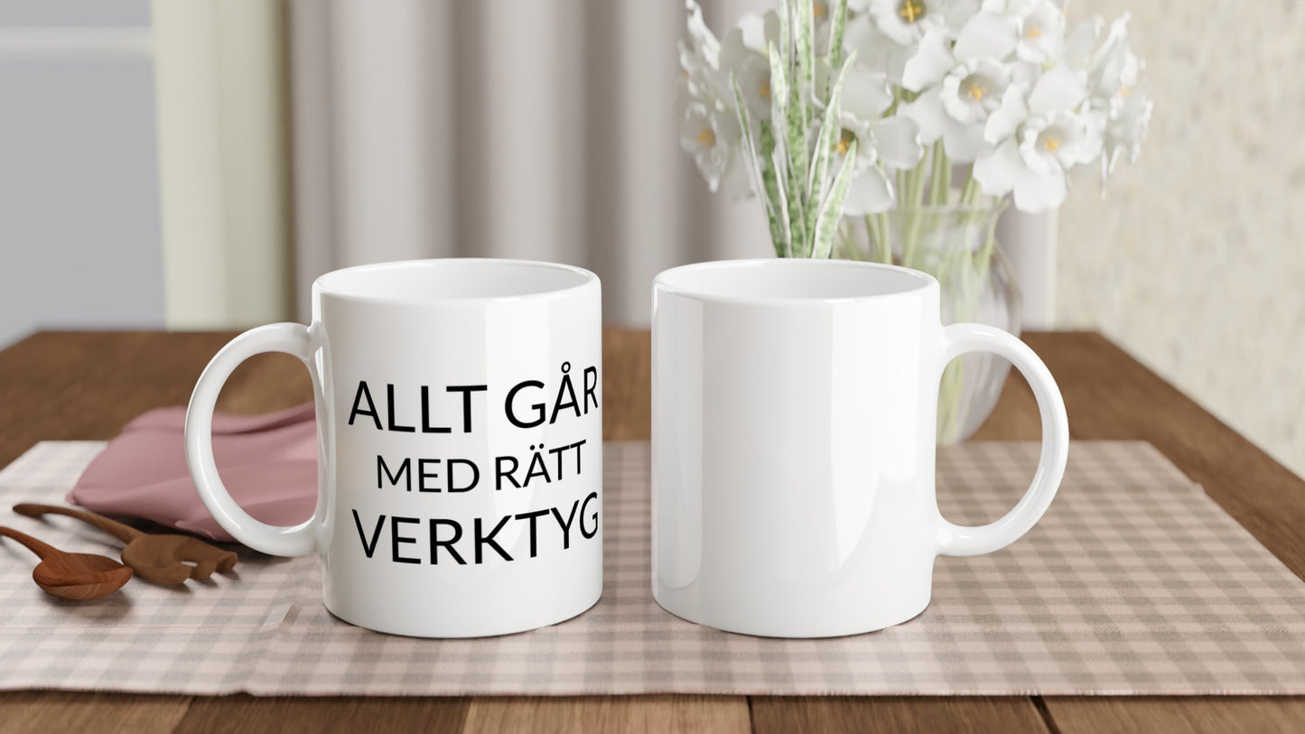 Allt går med rätt verktyg – mugg med tryck i stilren, tålig keramik. Perfekt för kaffeälskare som vill ha en personlig mugg med unikt motiv.Tål både diskmaskin och mikrovågsugn och passar lika bra hemma som på kontoret eller som present.