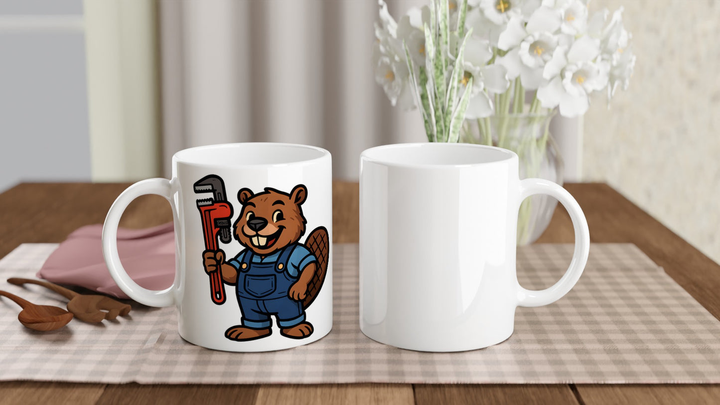 Bäverkraft i rörmokeri – mugg med tryck i stilren, tålig keramik. Perfekt för kaffeälskare som vill ha en personlig mugg med unikt motiv.Tål både diskmaskin och mikrovågsugn och passar lika bra hemma som på kontoret eller som present.