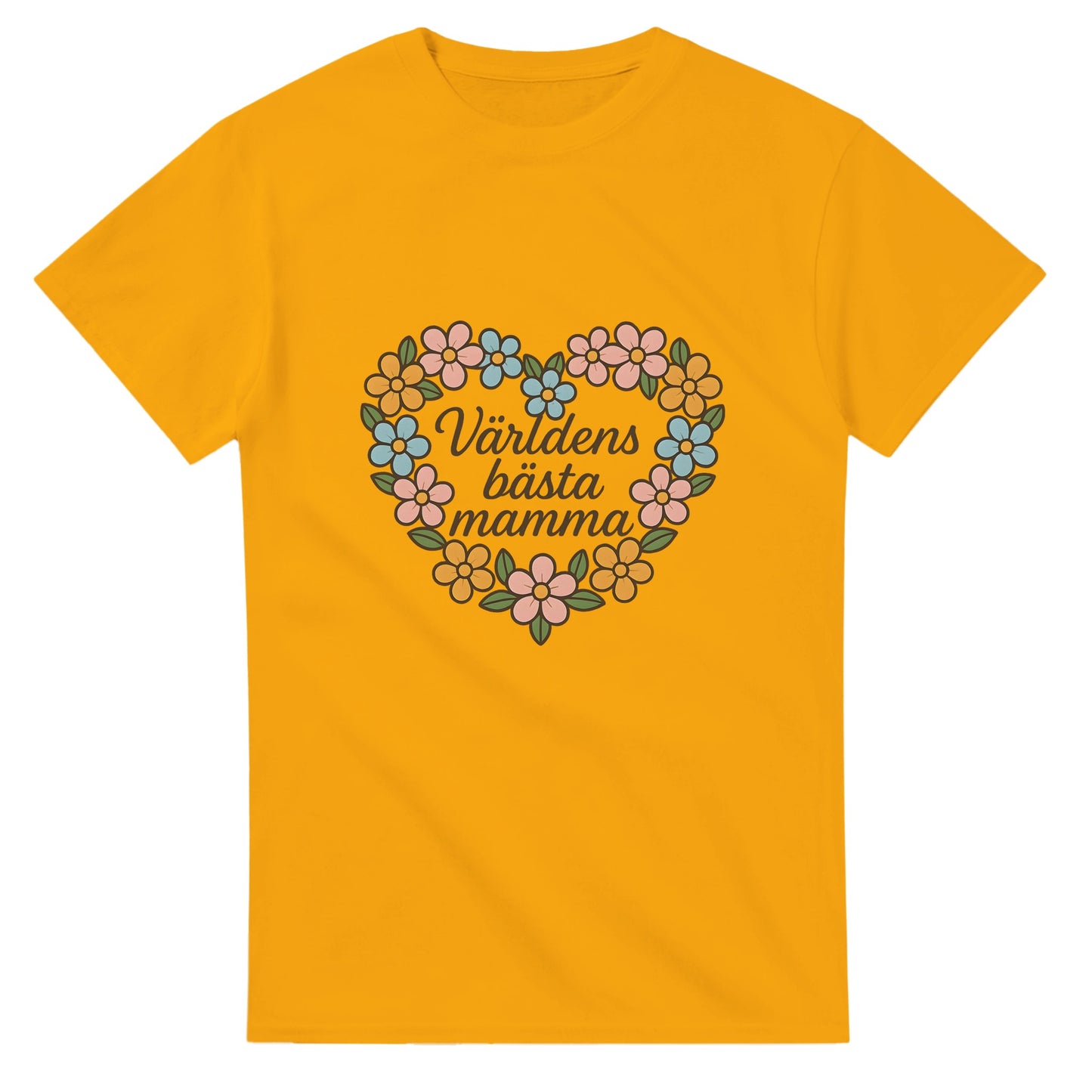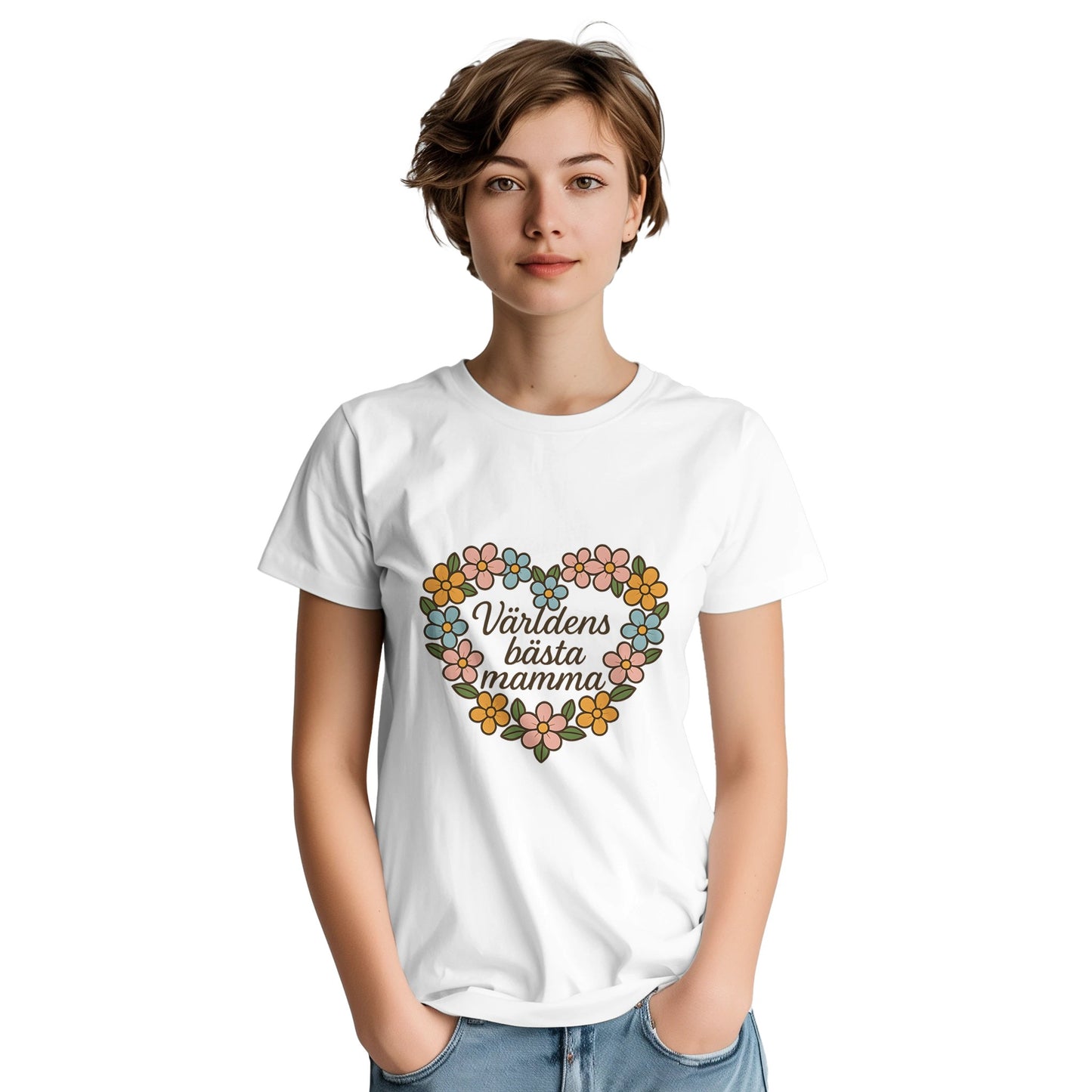 Ett hjärta av pastellfärgade blommor omger texten 'Världens bästa mamma'. Perfekt för att hylla mamma!