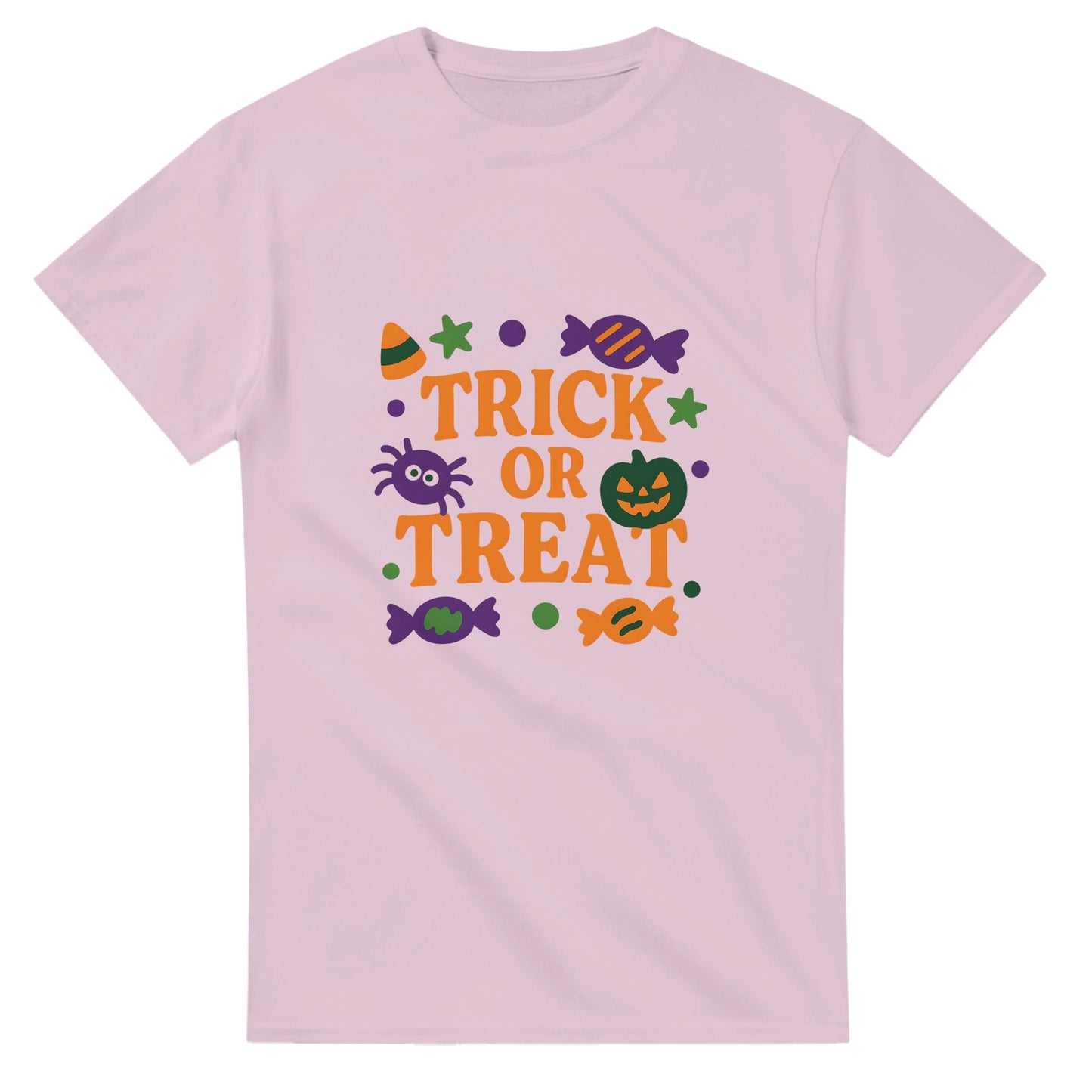 En lekfull Halloween-t-shirt med texten 'TRICK OR TREAT' i livfulla godisfärger. Perfekt för att sprida Halloween-glädje!