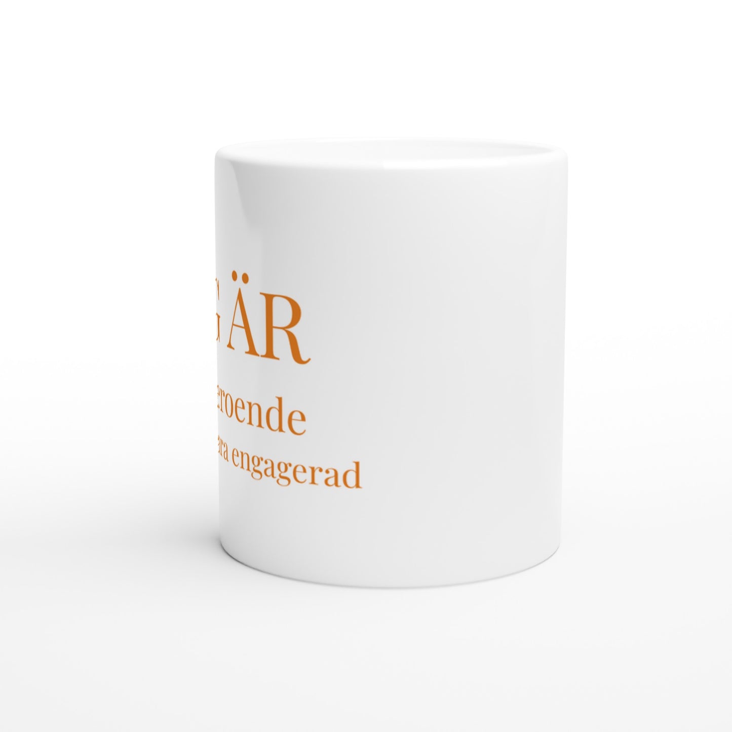 Cafékomedi – mugg med tryck i stilren, tålig keramik. Perfekt för kaffeälskare som vill ha en personlig mugg med unikt motiv.Tål både diskmaskin och mikrovågsugn och passar lika bra hemma som på kontoret eller som present.