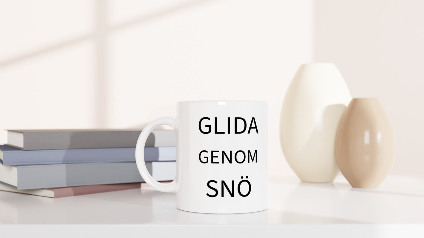 Glida i Snö – mugg med tryck i stilren, tålig keramik. Perfekt för kaffeälskare som vill ha en personlig mugg med unikt motiv.Tål både diskmaskin och mikrovågsugn och passar lika bra hemma som på kontoret eller som present.