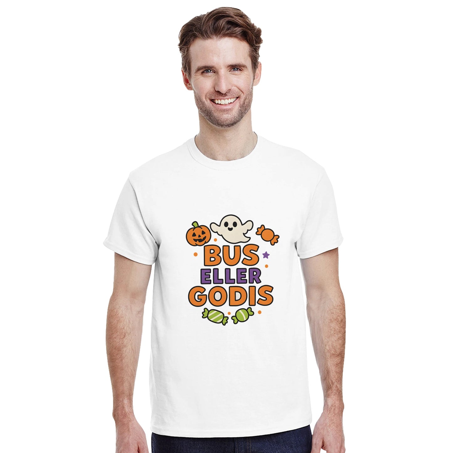 Halloween Bus eller Godis – t-shirt med tryck i mjuk och slitstark bomull. Klassisk unisex-passform som passar både vardag och fritid. Tillverkad i premium heavyweight-bomull för hållbarhet och komfort.Ett perfekt val för dig som vill ha en unik t-shirt eller ge bort en personlig present.