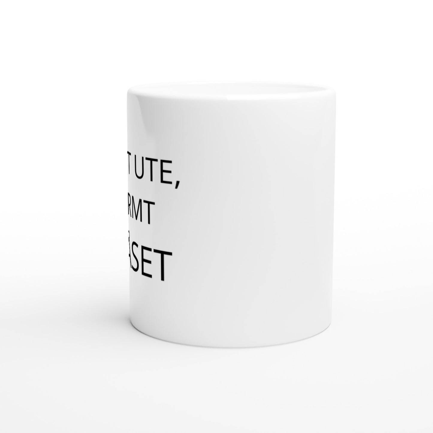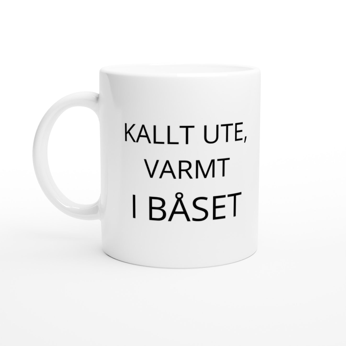 Kallt Ute, Varmt I Båset – mugg med tryck i stilren, tålig keramik. Perfekt för kaffeälskare som vill ha en personlig mugg med unikt motiv.Tål både diskmaskin och mikrovågsugn och passar lika bra hemma som på kontoret eller som present.