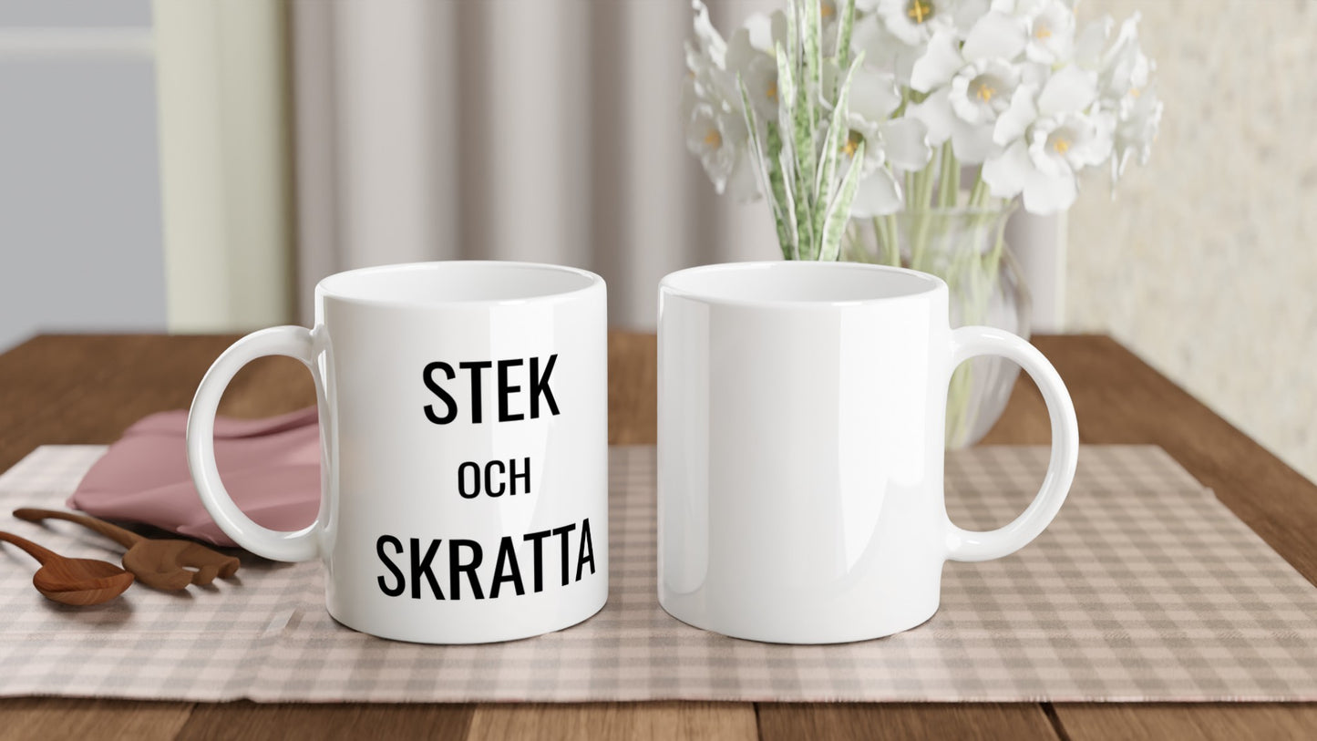 Stek och Skratta – mugg med tryck i stilren, tålig keramik. Perfekt för kaffeälskare som vill ha en personlig mugg med unikt motiv.Tål både diskmaskin och mikrovågsugn och passar lika bra hemma som på kontoret eller som present.